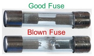 Fuses are another example of safety devices that protect equipment from overcurrents. Fuses are found in most commercial equipment, and come in several varieties. When too much current flows through a fuse, the conductor inside the fuse melts, permanently disconnecting the circuit. The melting of this wire is commonly referred to as “blowing a fuse.” Below is a comparison of a functional fuse versus a blown fuse: